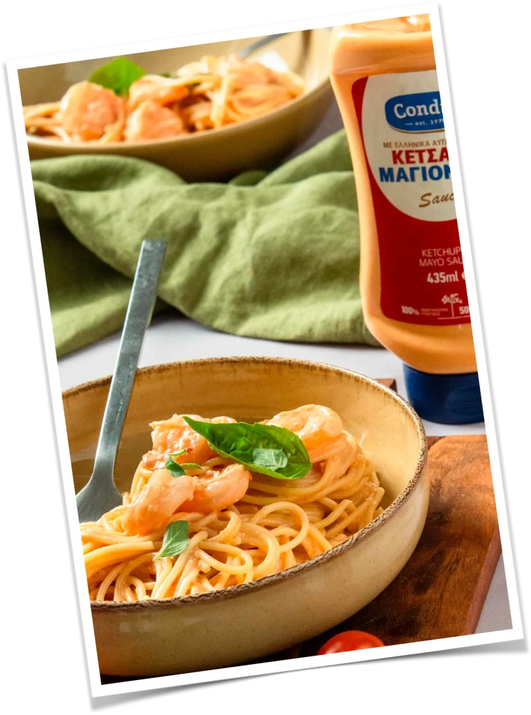 In a bowl, combine the Condito Ketchup & Mayo Sauce, tomatoes, horseradish, lemon juice, soy sauce, and olive oil. Blend until smooth. Add the shrimp, salt, pepper, lemon zest, and lemon juice and mix. Meanwhile, cook the pasta according to…