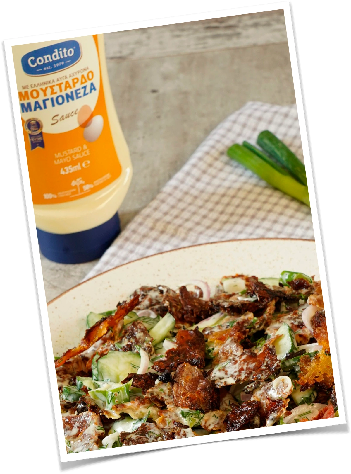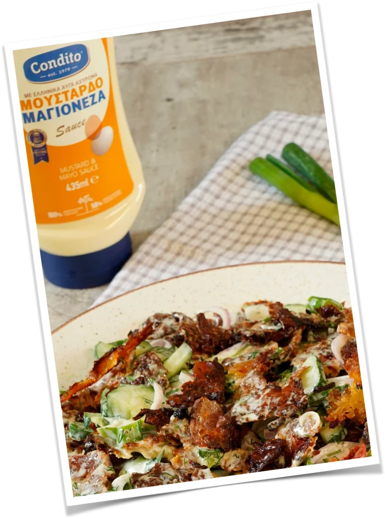 Finely chop the cucumber, spring onions, parsley, dill, roasted Florina pepper, and slice the red onion thinly. Add all the chopped ingredients to the bowl with the dressing. Mix thoroughly, then add the crispy potatoes, broken into medium-sized chunks.