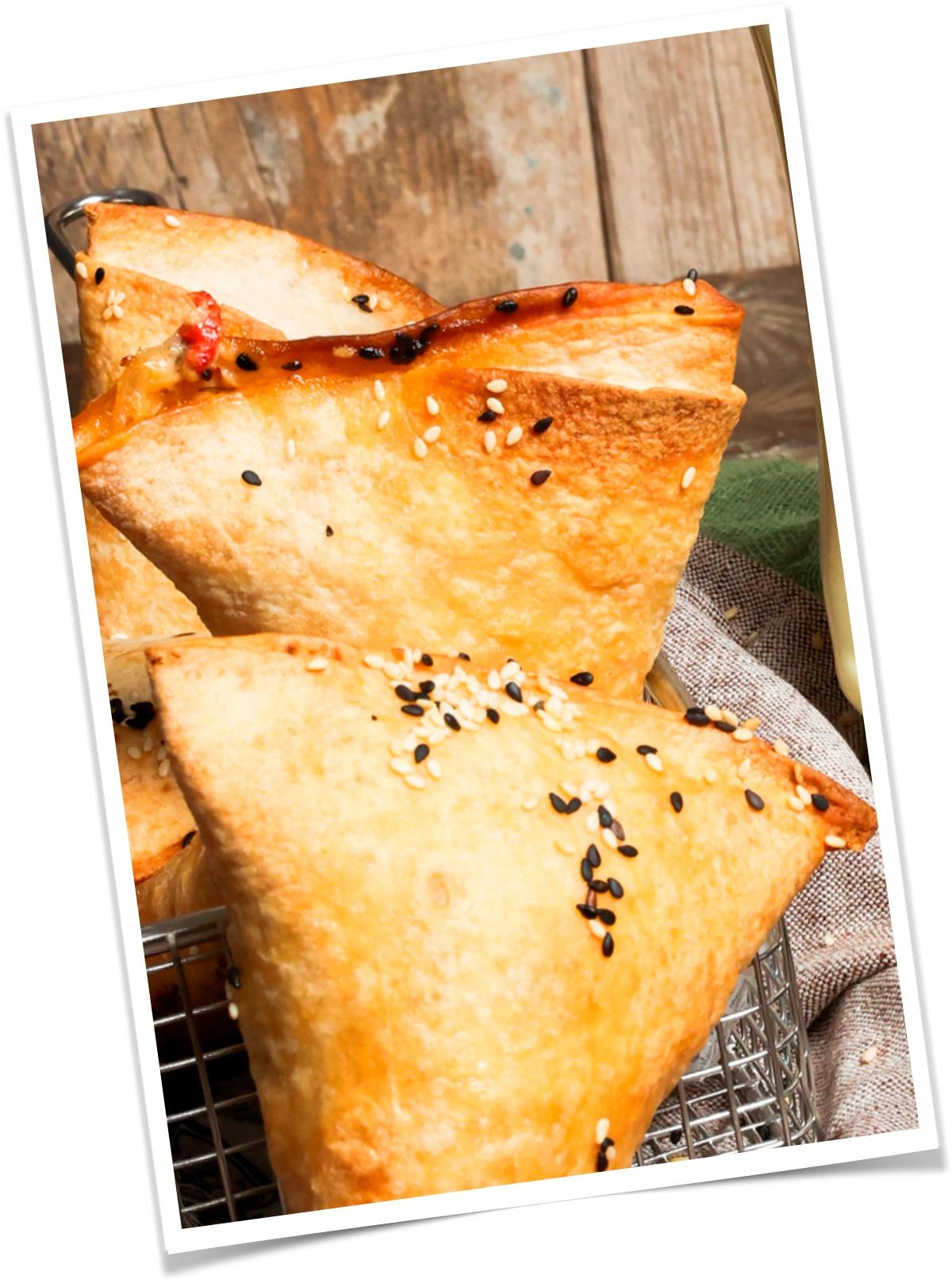 Line a 26×36 cm baking tray with parchment paper. Arrange the filled pockets side by side on the tray. Brush the tops with olive oil and sprinkle with both black and white sesame seeds. Bake for 15 minutes, until golden and crispy. Let them cool for 5 minutes.