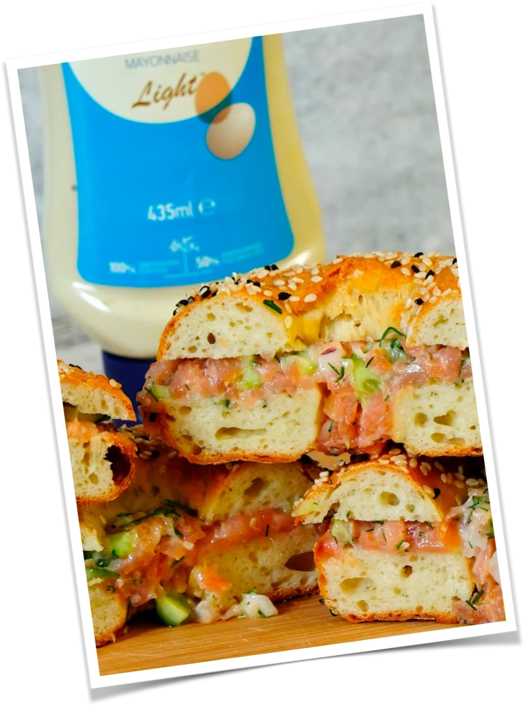 Slice the bagels in half horizontally with a serrated knife and fill generously with the salmon mixture.