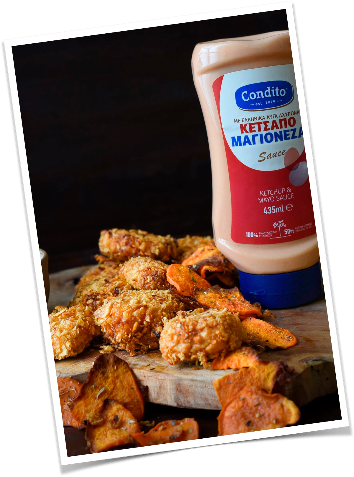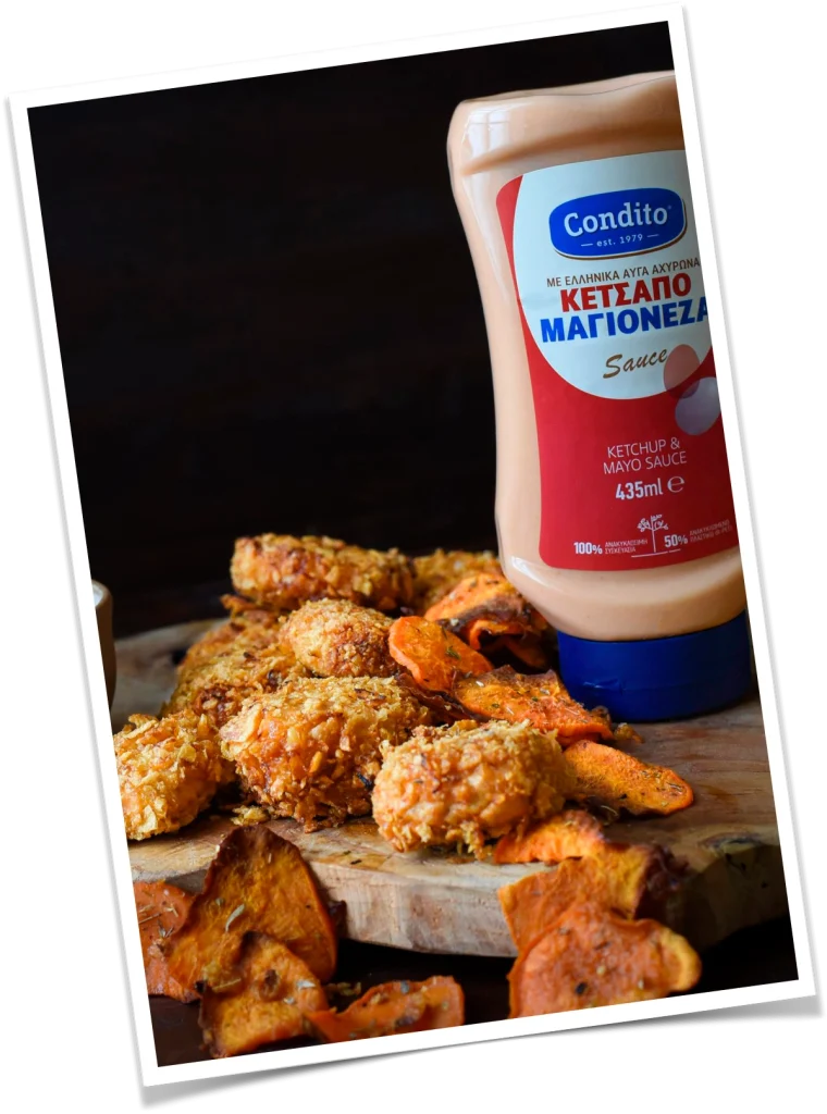 In a food processor, pulse the corn flakes 4-5 times until they are not completely crushed. In the same food processor, blend the chicken fillets with the onion, paprika, and salt. With your hands, shape the chicken mixture into small chicken bites. Coat them completely with Ketchup & Mayo Sauce Condito. Let them marinate in the fridge for as long as you have.